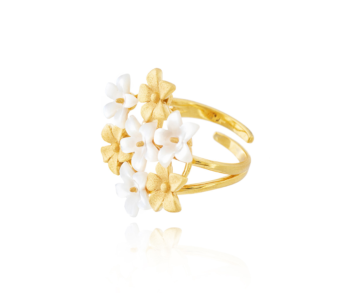 El diseño de este anillo es verdaderamente encantador. El brazo abierto del anillo se adorna con una exquisita combinación de flores en plata de ley con baño de oro y flores de nácar. Cada detalle está cuidadosamente elaborado para crear una armonía visual y un efecto deslumbrante.