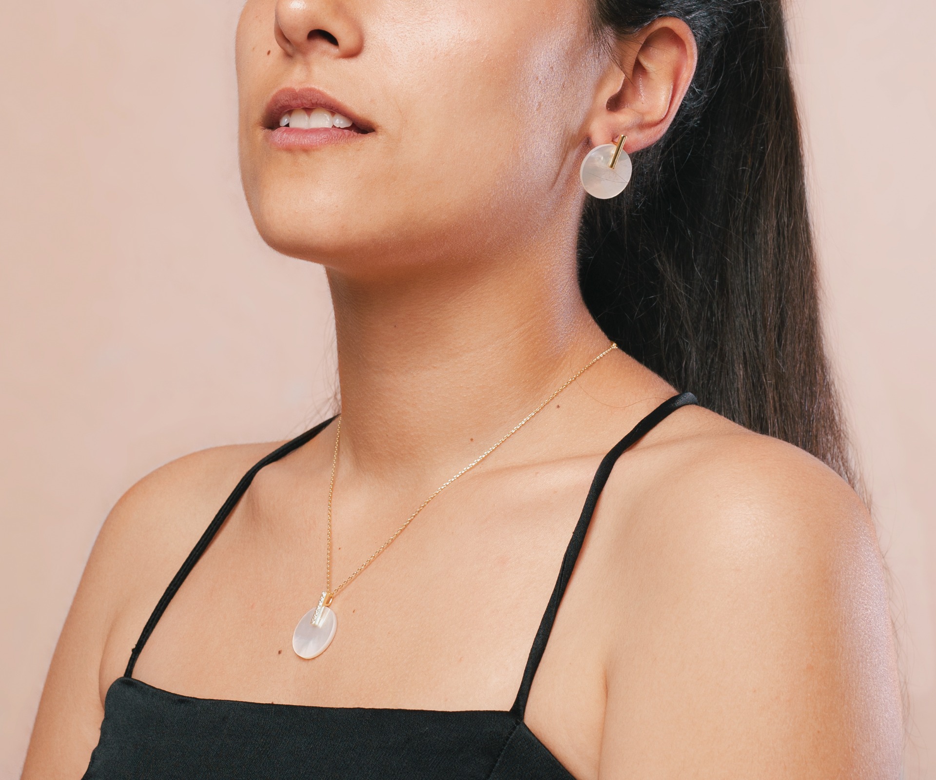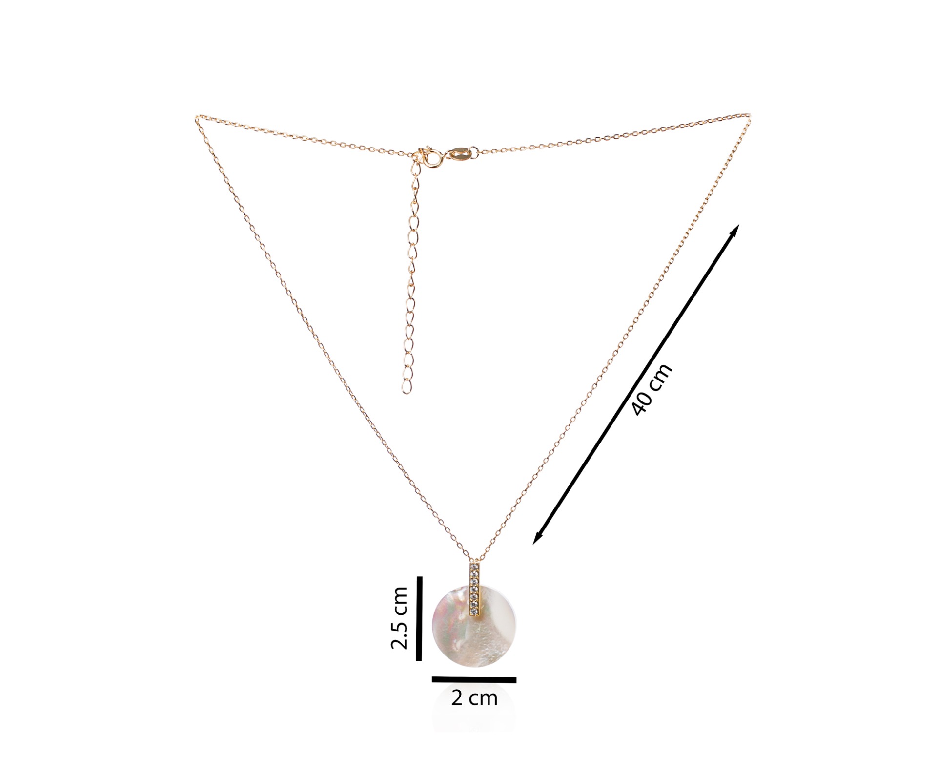 En el extremo de la cadena, encontrarás un colgante de disco de nácar, realzando la belleza natural de este material. El colgante está adornado con una filigrana en plata de ley, que añade un toque de elegancia y detalle artesanal. Además, cuenta con 7 incrustaciones de circonita blanca, que brindan un brillo sutil y encantador.