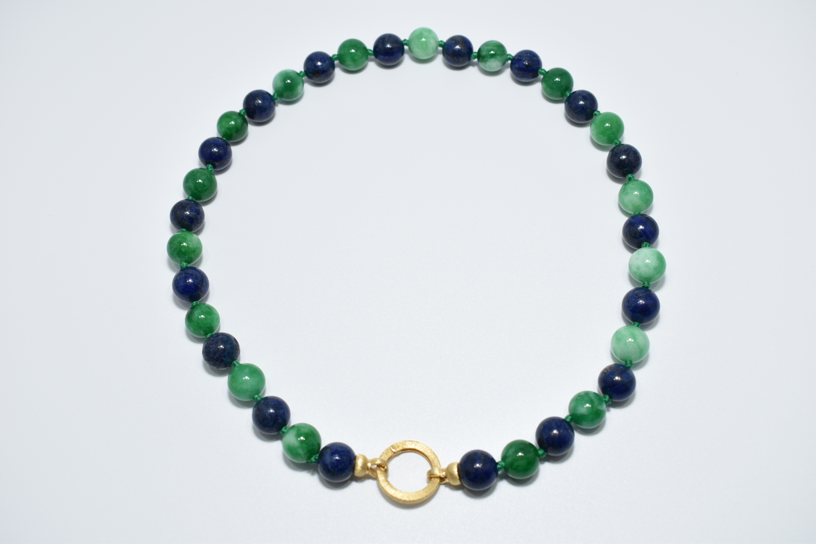 Destaca con este impresionante collar de cuentas de jade y lapizlázuli, cerrado con un cierre marinero en plata de ley con baño de oro efecto metalizado. Disfruta de la belleza natural de las piedras preciosas y añade un toque de distinción a tu estilo.