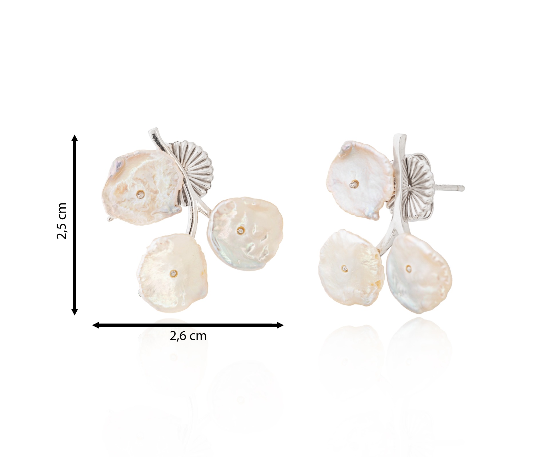 Pétalos nacarados en movimiento suave, con un acabado plateado luminoso.