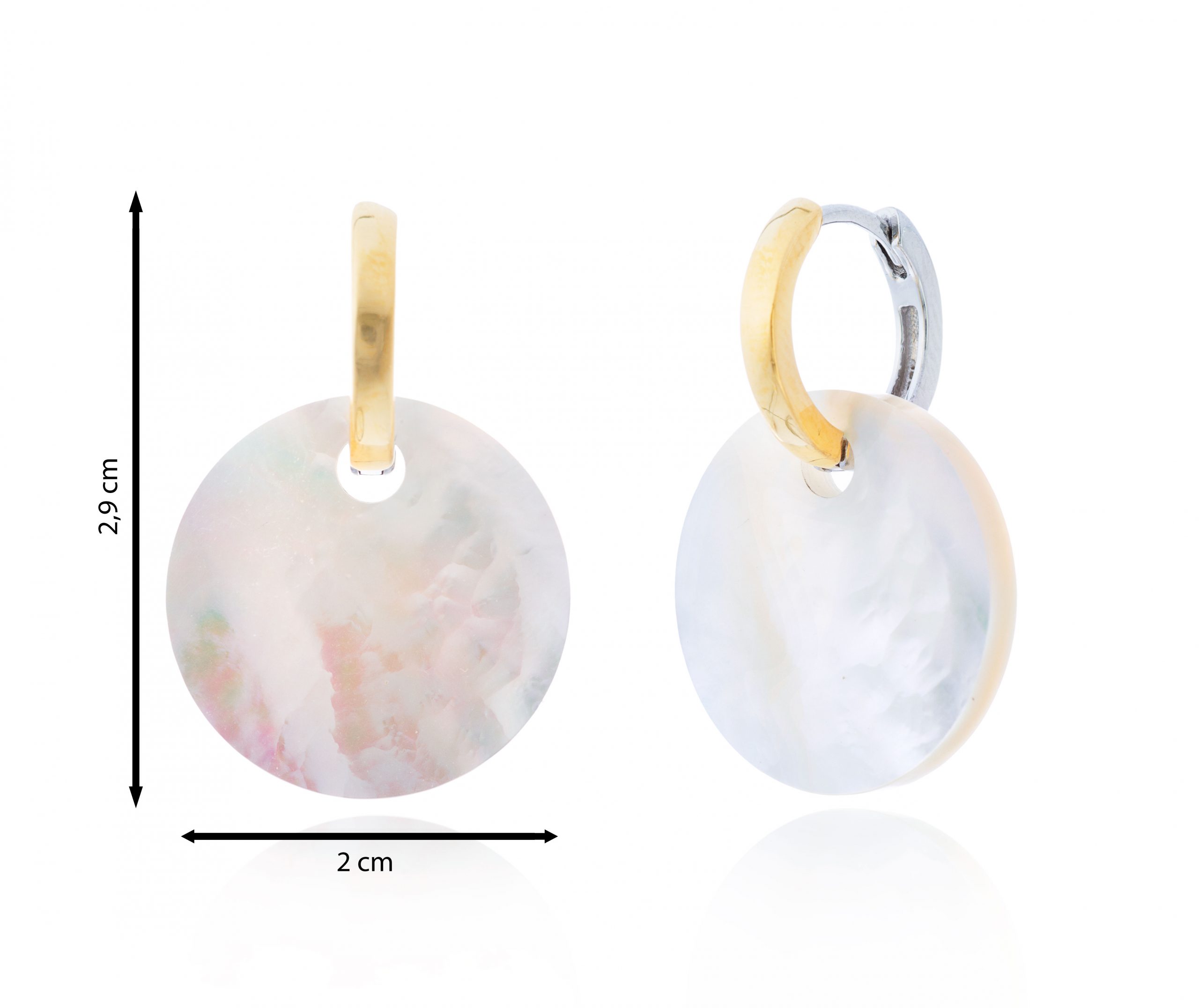 Colgante circular de nácar suspendido de aro bicolor. Un diseño luminoso y suave con un acabado natural.