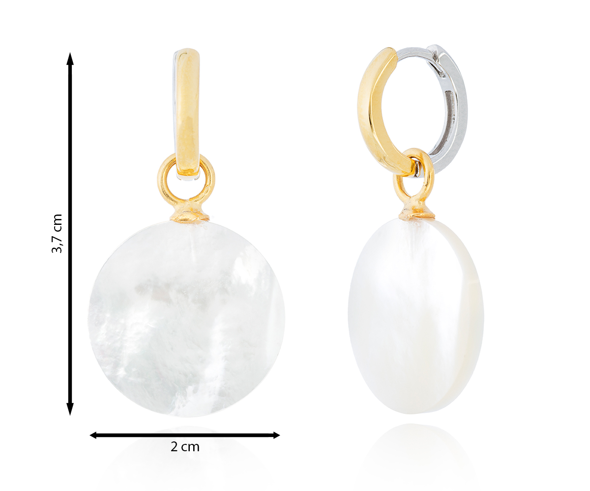 El engarce dorado en el centro del pendiente agrega un detalle llamativo y crea un punto focal elegante. Además, el disco de nácar aporta un brillo suave y una textura sutil, que complementa a la perfección el diseño bicolor.