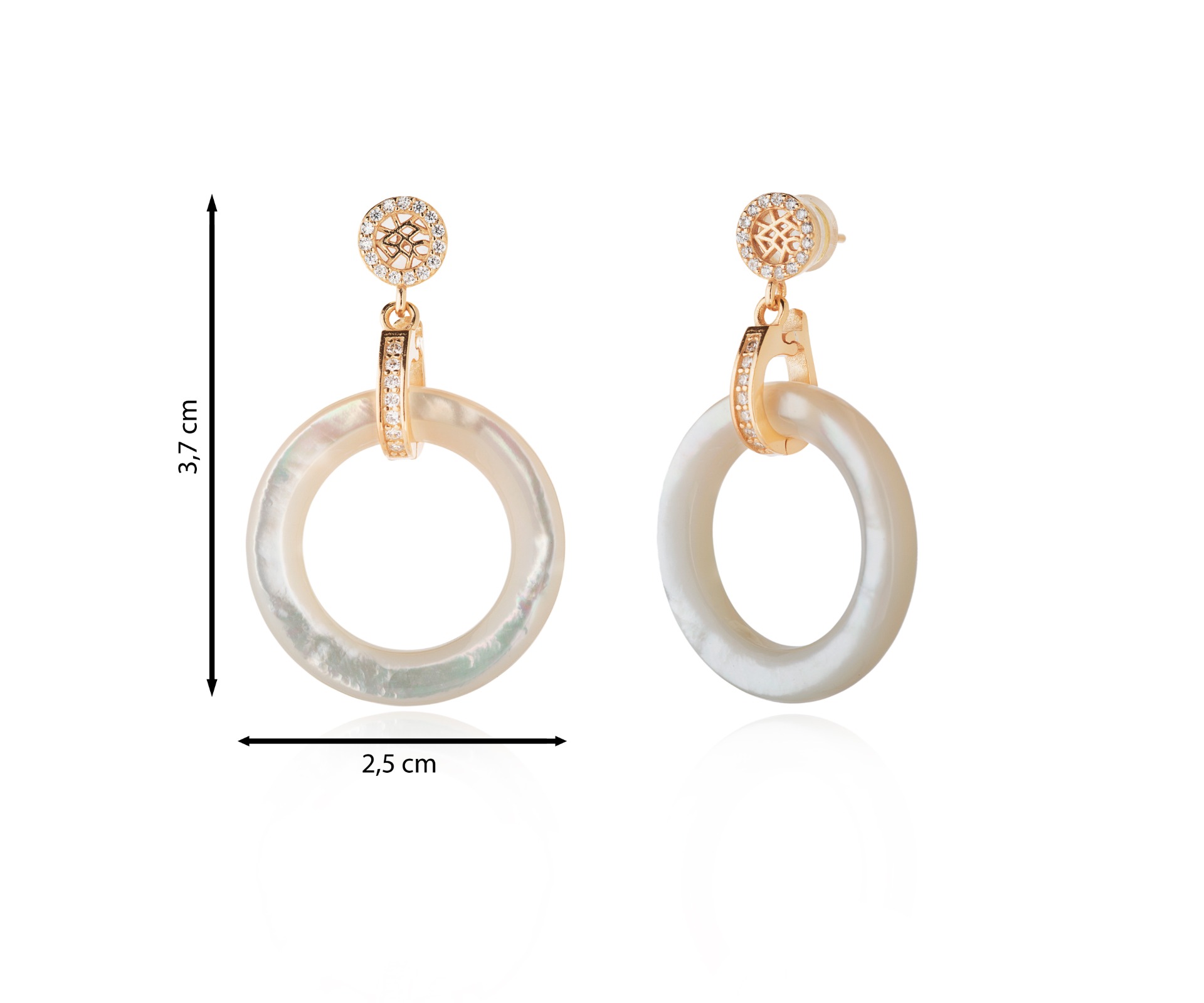 El diseño del aro en nácar aporta una dimensión única a esta joya. El nácar, con su brillo iridiscente y tonos suaves, crea un contraste encantador que captura la atención y resalta la belleza de cada detalle. Estos pendientes no solo complementan tu estilo, sino que también cuentan una historia de lujo y distinción.