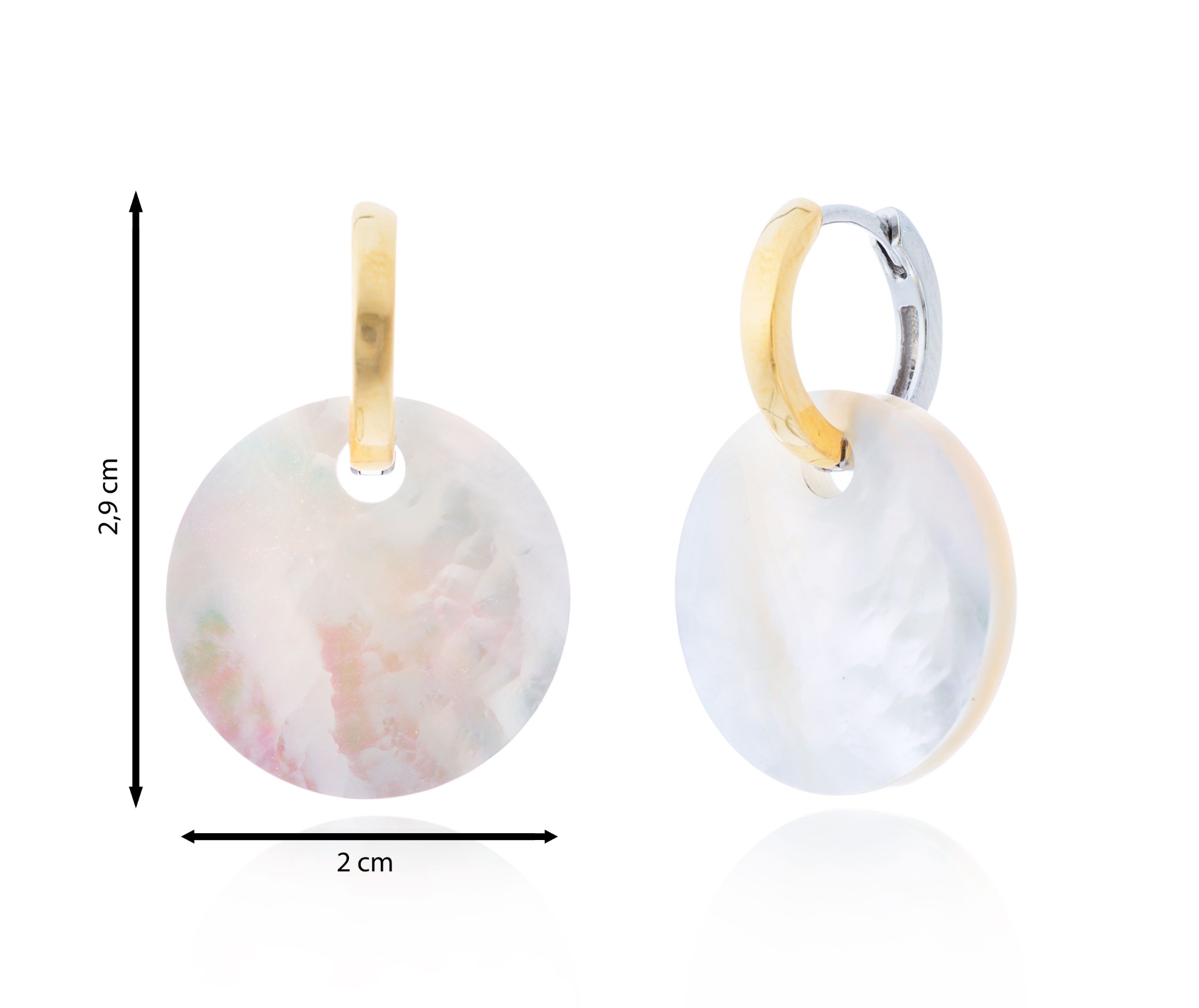 En la parte delantera del aro, encontrarás un círculo completo en nácar, que le da un aspecto actual y contemporáneo a estos pendientes. El nácar, con su brillo suave y su textura delicada, agrega un toque de elegancia y sofisticación a tu conjunto.