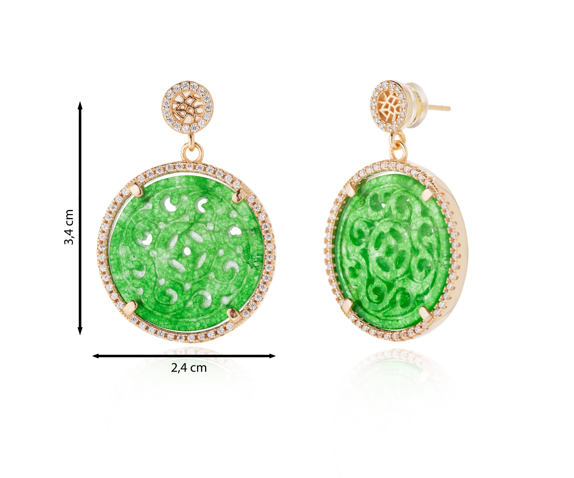 ¡Embárcate en un viaje hacia la prosperidad con nuestros cautivadores pendientes de plata de ley con baño de oro, engalanados con resplandecientes circonitas blancas y un medallón de jade, símbolo eterno de fortuna y prosperidad! Estos no son simplemente pendientes; son talismanes de elegancia que te conectarán con la abundancia y el buen gusto.