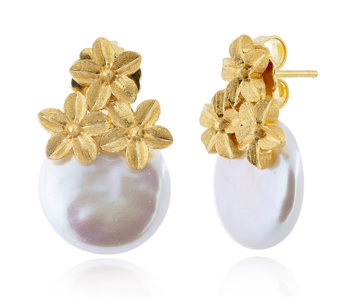 Pendiente perla botón con flores azar doradas