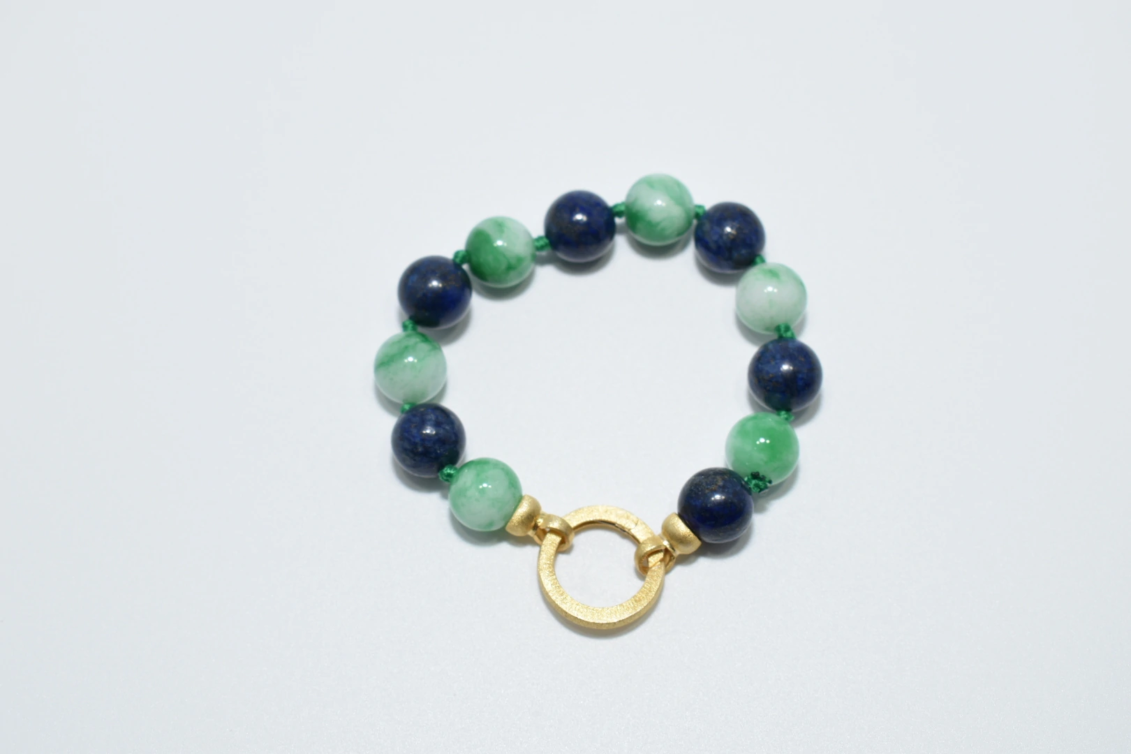 ¡Déjate cautivar por la belleza y la energía vibrante de nuestra pulsera con cuentas de lapislázuli y jade, con un broche de diseño Nubey en plata de ley con baño de oro de 18k y efecto metalizado!